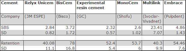 Conclusion: Tested self-adhesive resin cements exhibited relatively low bonds to dentin except for Multilink (with priming). Retention values ranging from 40.8 to 54.46 MPa were not significantly different except for BisCem at 78 MPa.